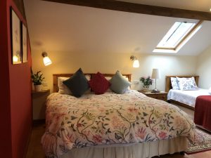 A one-bedroom loft conversion complete with bullseye window and views over open countryside. Bedroom with super-kingsize bed, single bed and en-suite shower. Open-plan living space with fully fitted kitchen.